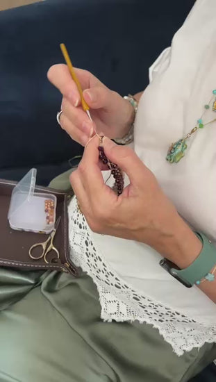 Cadena de hilo dorado tejida a mano con bolitas de colores.
