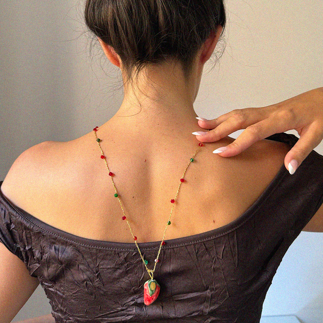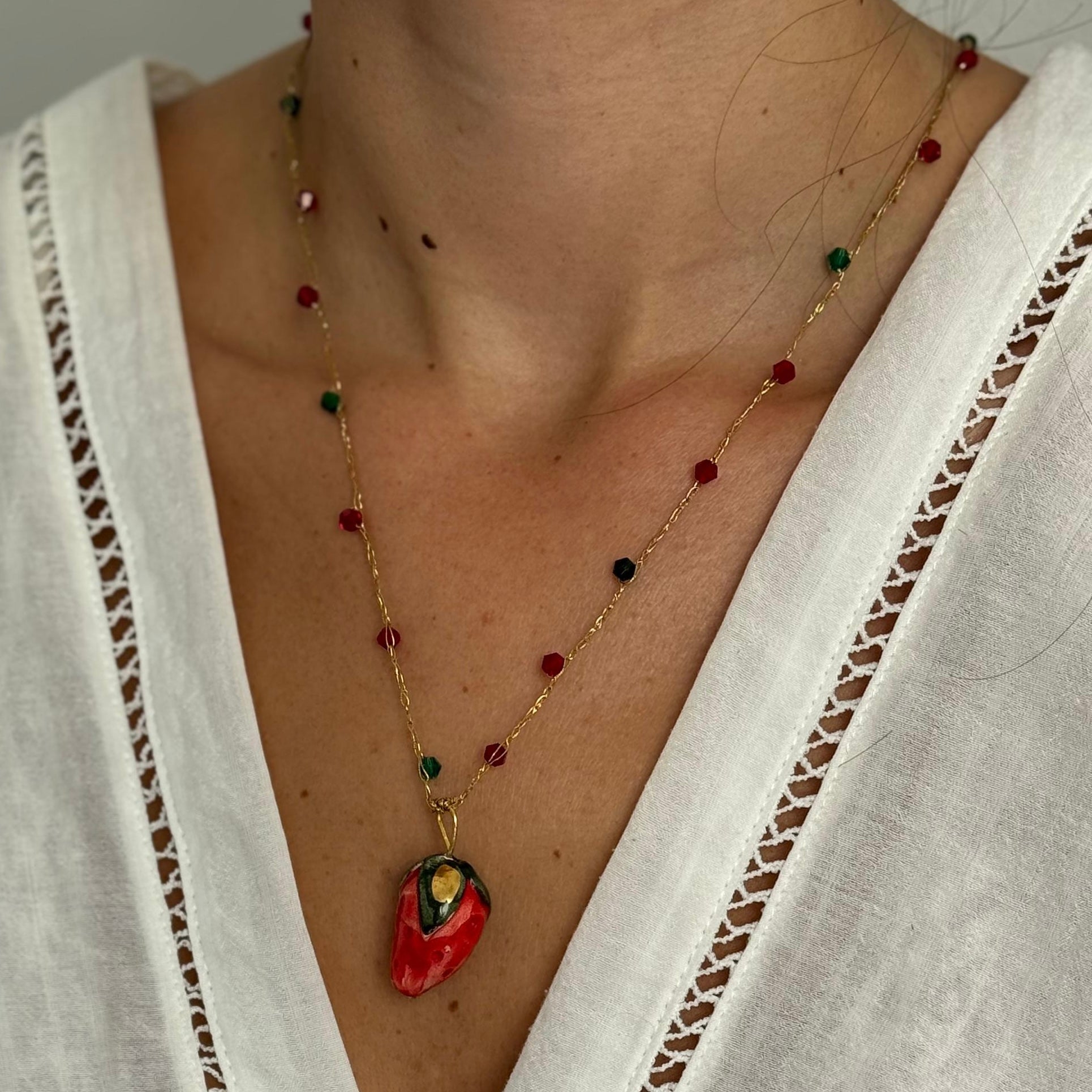 Cadena tejida a mano con hilo dorado y bolitas de colores. Fresa de cerámica siciliana de Caltagirone.