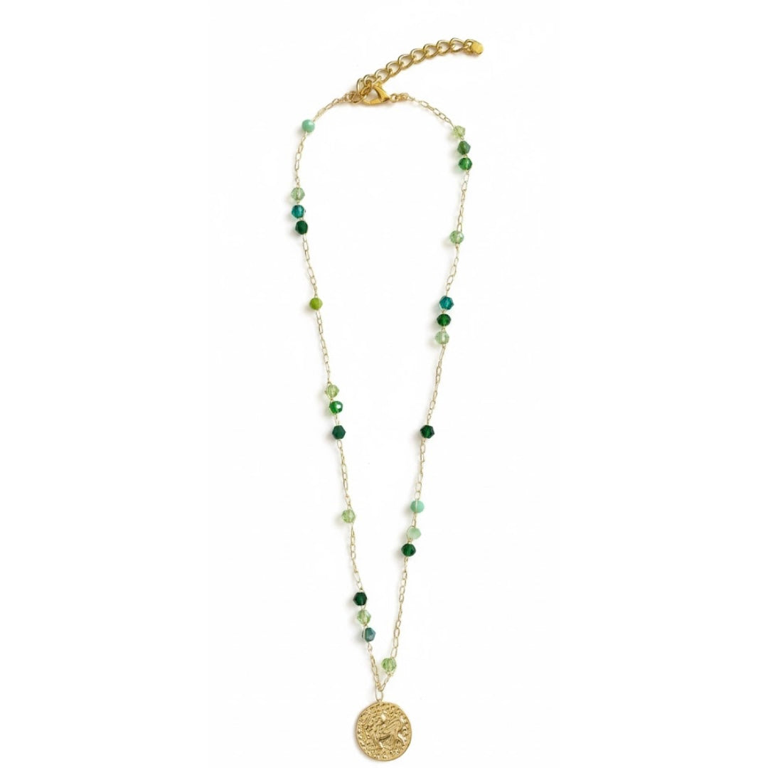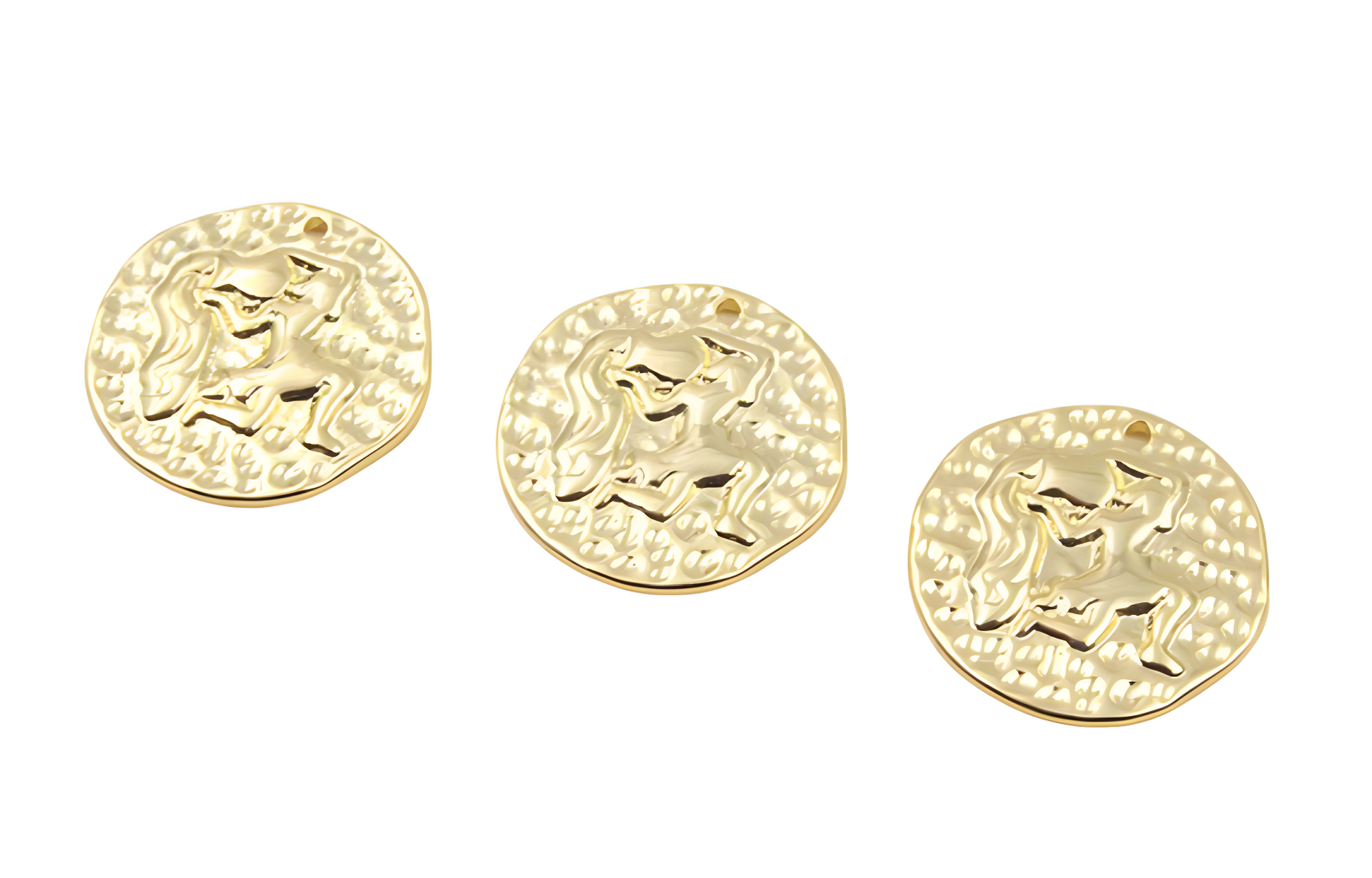 Cadena tejida a mano con hilo dorado, bolitas de colores y medalla de latón dorado con signo del horóscopo.